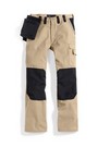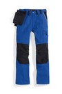 60% Baumwolle, 40% Polyester, Gummizug im Rücken, Bundfalten, breite Gürtelschlaufen für Gürtel bis ca. 5 cm Breite, 2 Seitentaschen, 1 verschließbare Gesäßtasche von innen verstärkt, 2 Schenkeltaschen, davon 1 mit aufgesetzter Handy-Tasche und 1 mit integrierter Zollstocktasche, Farben: dunkelblau, königsblau,weiß, schwarz, sand, dunkelgrau und rot